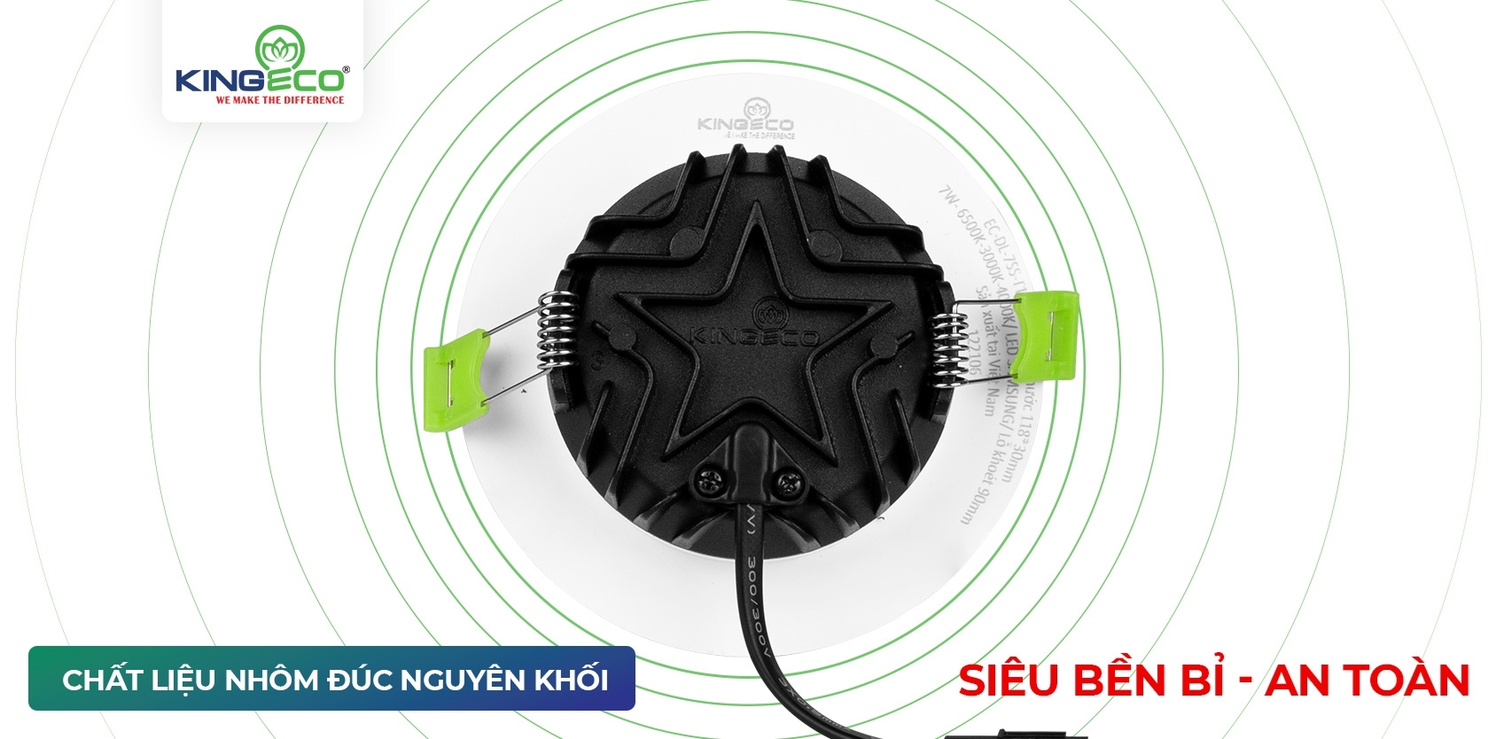 Đèn Downlight Âm Trần 7W D90 Đơn Sắc EC-DLSS từ KingEco được thiết kế để đáp ứng các tiêu chuẩn chiếu sáng hiện đại, mang lại hiệu quả, thẩm mỹ và độ bền vượt trội. Dưới đây là những điểm nổi bật khiến sản phẩm này được ưa chuộng: