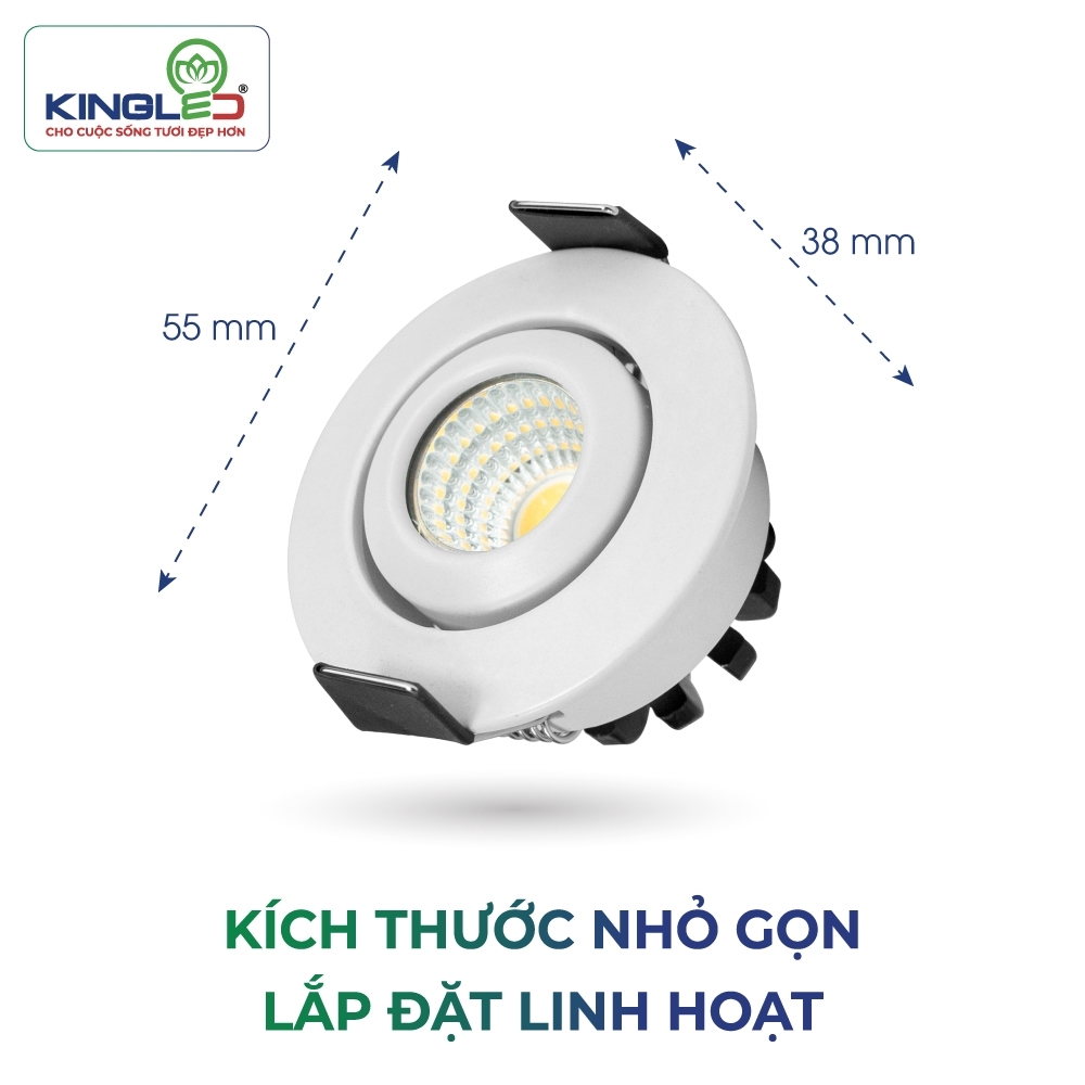 Tiêu chuẩn thiết kế: Kích thước Ø55 x 38mm nhỏ gọn và lỗ khoét Ø44mm phù hợp với trần thạch cao hoặc gỗ, dễ dàng lắp đặt ở vị trí hẹp hoặc theo cụm.
