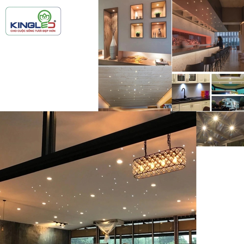 Trong nhà ở, ánh sáng vàng ấm (3000K) tạo không khí thân mật cho phòng khách, lý tưởng để chiếu nhấn vào tranh treo tường, kệ sách hoặc lọ hoa. Phòng ngủ sử dụng ánh sáng trung tính (4000K) giúp thư giãn, trong khi góc trang trí tận dụng ánh sáng trắng sáng (6500K) để làm nổi bật đồ nội thất nhỏ.