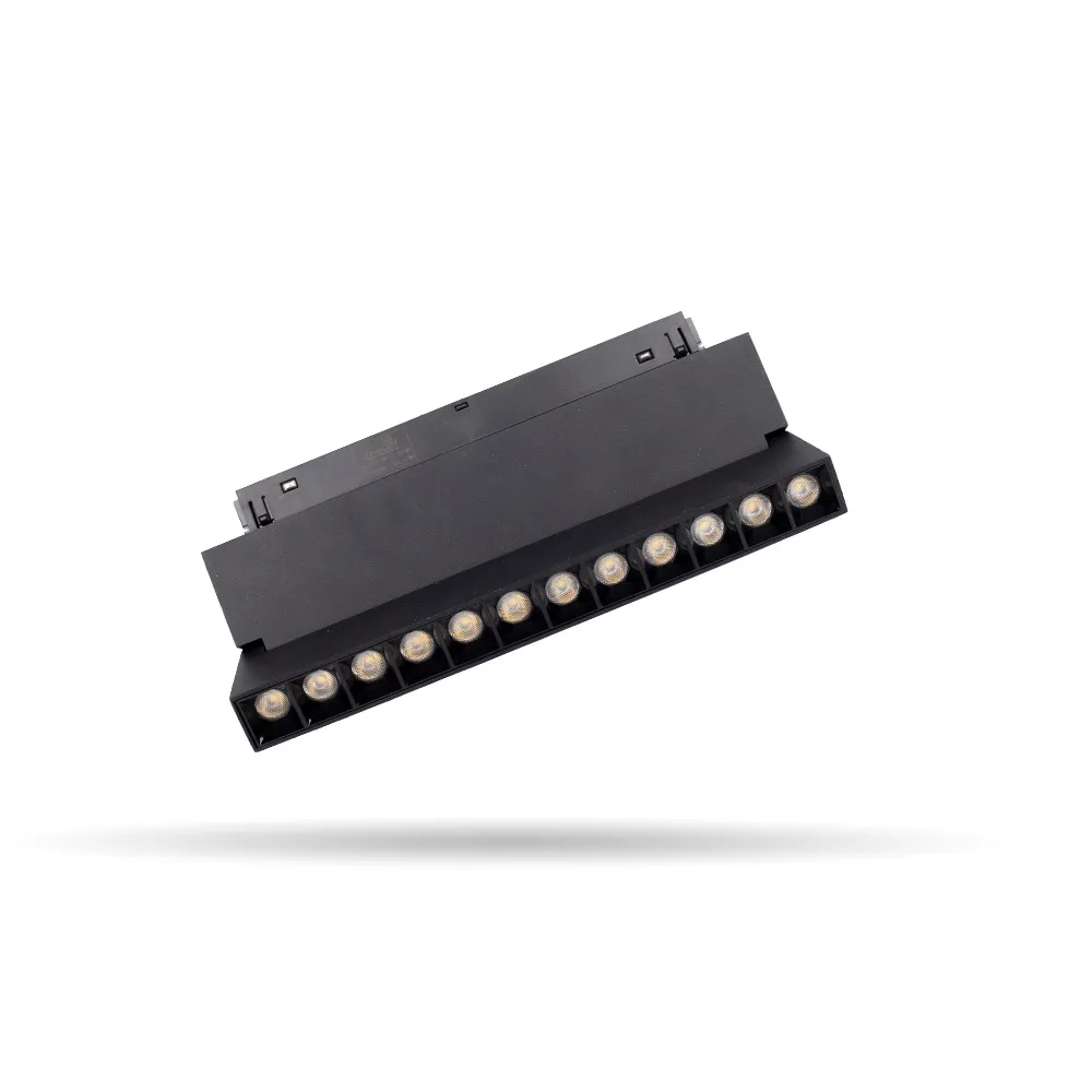 Lớp vỏ màu đen nhám (Matte Black) kết hợp với thiết kế Linear (dạng thanh) tạo nên vẻ đẹp sang trọng, bí ẩn. Khi lắp trên hệ ray nam châm, đèn trở thành một phần của kiến trúc trần, phù hợp với mọi phong cách từ Minimalism (Tối giản), Industrial (Công nghiệp) đến Modern Luxury.